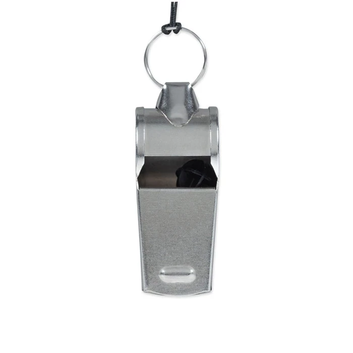 Metalowy gwizdek przymocowany do smyczy z klamrą bezpieczeństwa.