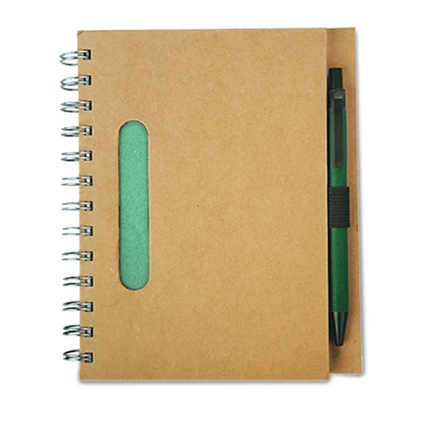 Notatnik 70 kartek formatu B6 w linie z papieru z surowców wtórnych z długopisem o wymiarach 137x10x10 mm części plastikowe są biodegradowalne.